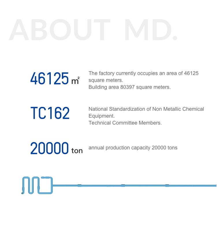 Zhejiang Maidui New Materials Co., Ltd. is located in the Jiaxing Port Area of China Chemical New Materials (Jiaxing) Park. The factory currently covers an area of 46125 square meters and has a building area of 80397 square meters. The company is a member of the TC162 National Non Metallic Chemical Equipment Standardization Technical Committee, dedicated to providing safe, reliable, and efficient corrosion-resistant pipeline system solutions for the industrial sector.